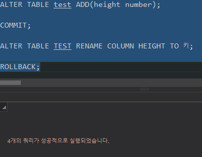 이번 결과는 COMMIT 한 이후의 ALTER명령어가 적용된 부분이 된다.